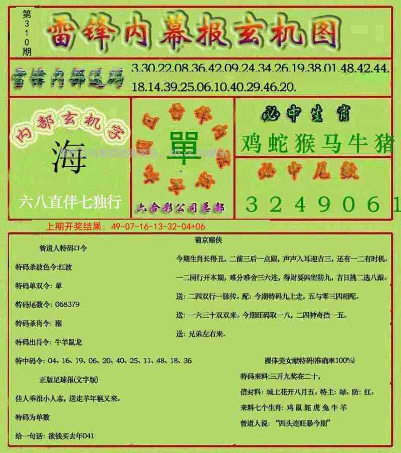 306期:男女两肖男肖+鸡蛇』开:牛17准